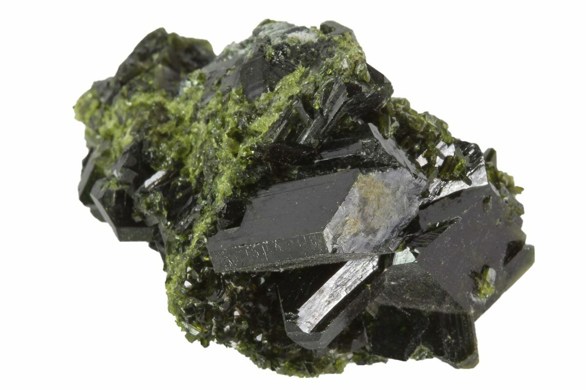 Epidote is a striking and often green mineral known for its complex crystal structure and vitreous luster. It is a calcium aluminum iron silicate that commonly forms in metamorphic rocks, particularly in regions that have undergone low to medium-grade metamorphism. The color of epidote typically ranges from pistachio green to dark green, although it can occasionally appear yellowish-green or even brown due to varying iron content.