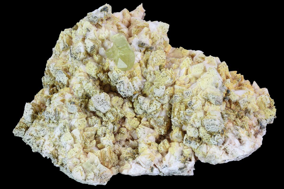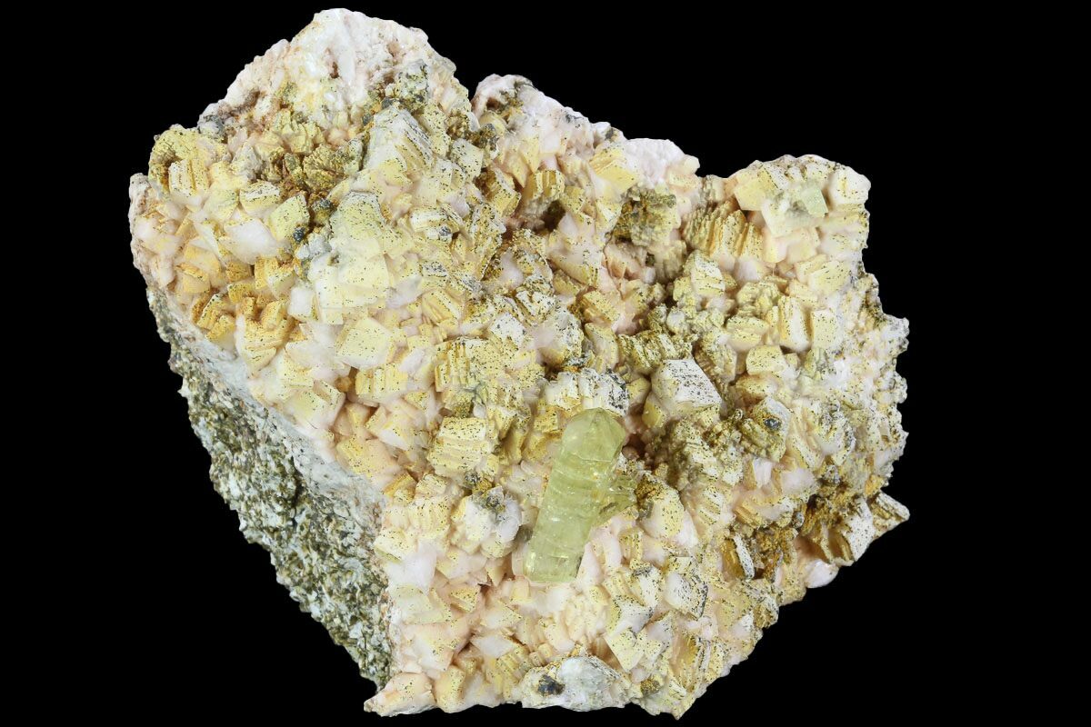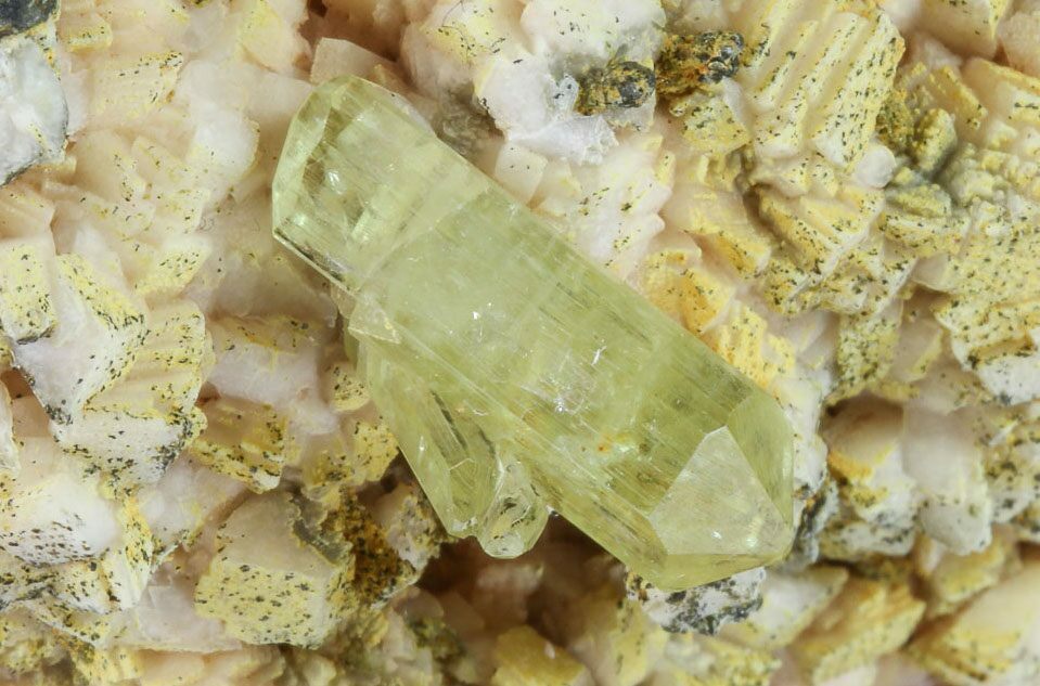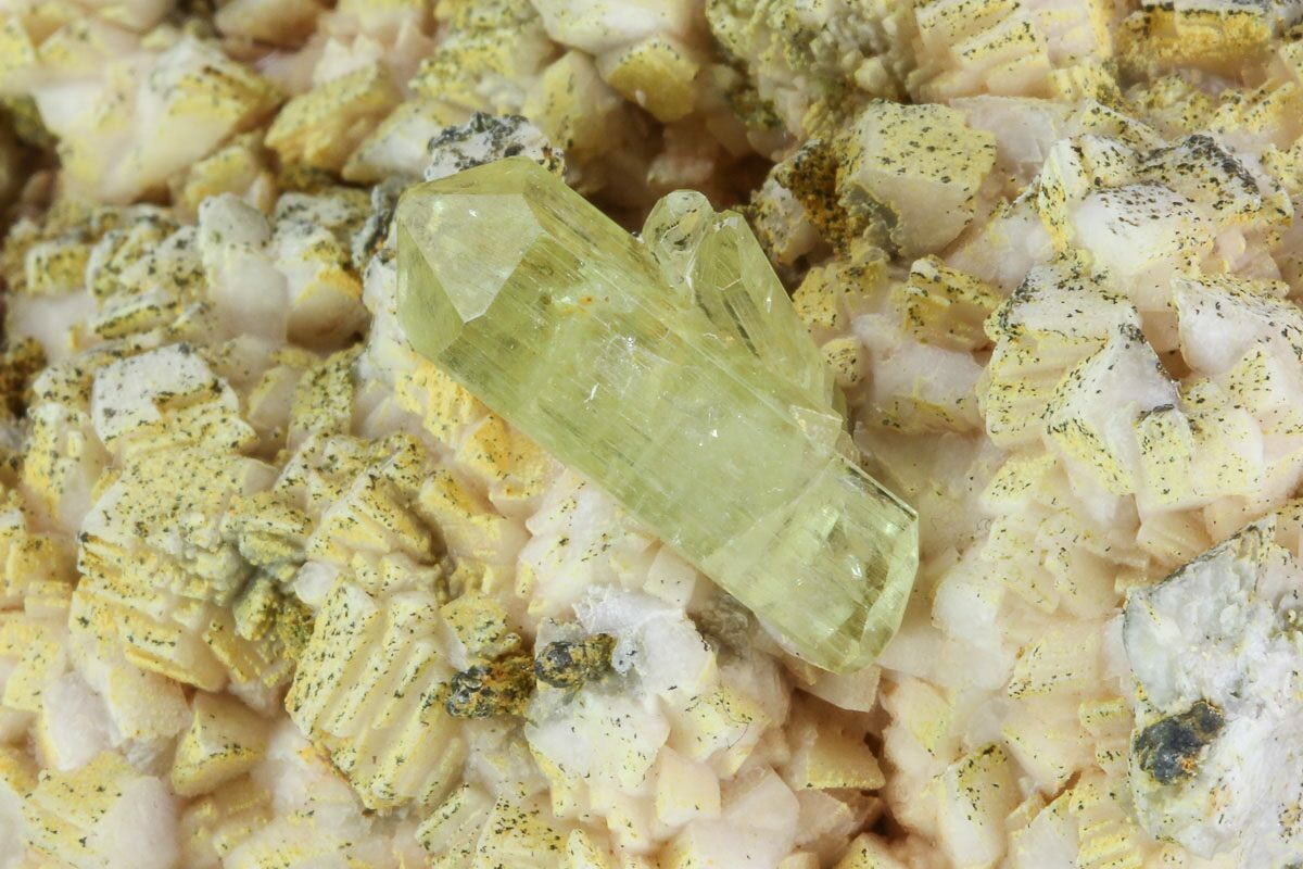 This specimen contains a pristine, greenish-yellow apatite crystal that formed from a feldspar aggregate. This crystal cluster was collected from Imilchil, Morocco.