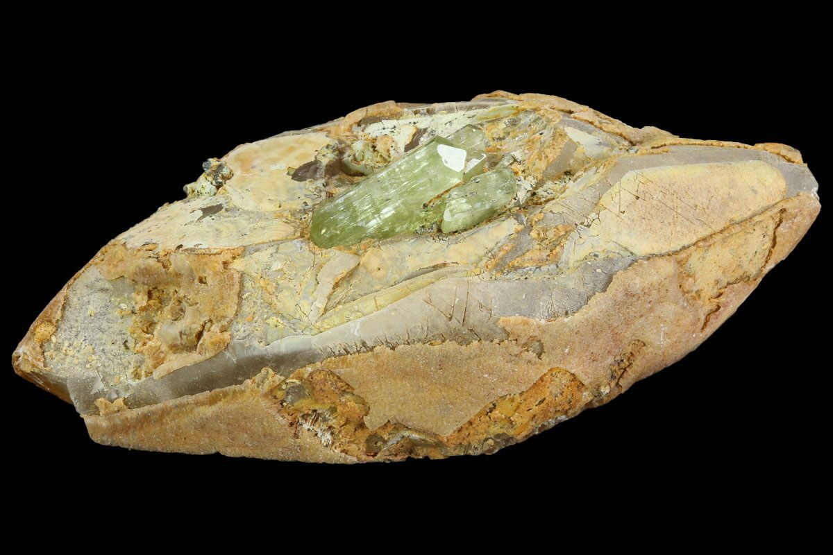 This specimen contains a greenish-yellow apatite crystal that formed from a calcite crystal. This crystal cluster was collected from Imilchil, Morocco.