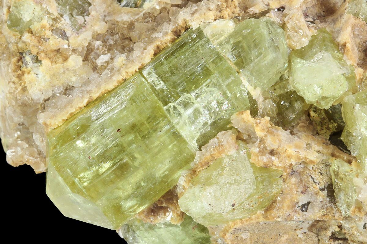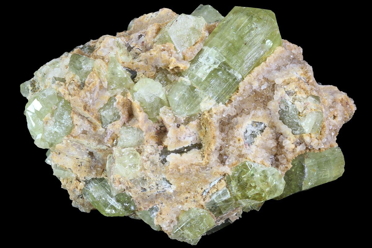 This specimen contains several greenish-yellow apatite crystals that formed as a cluster, glued together by calcite. This crystal cluster was collected from Imilchil, Morocco.