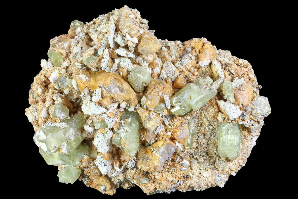 This specimen contains several beautiful, greenish-yellow apatite crystal that formed from a feldspar aggregate. This aggregation also contains calcite crystals, throughout. This crystal cluster was collected from Imilchil, Morocco.