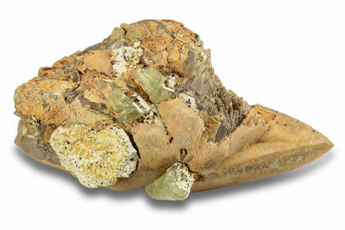 This specimen contains several greenish-yellow apatite crystals formed on a cluster of scalenohedral calcite, collected from Imilchil, Morocco.