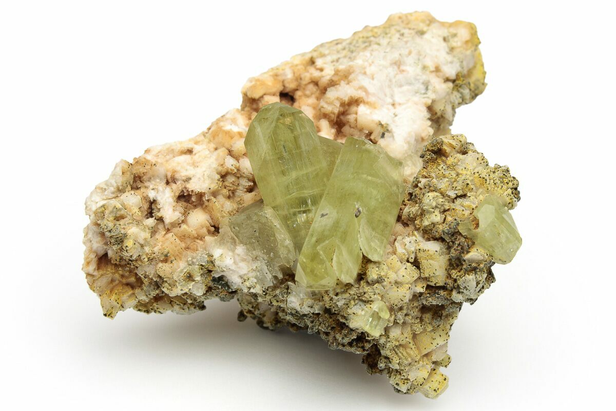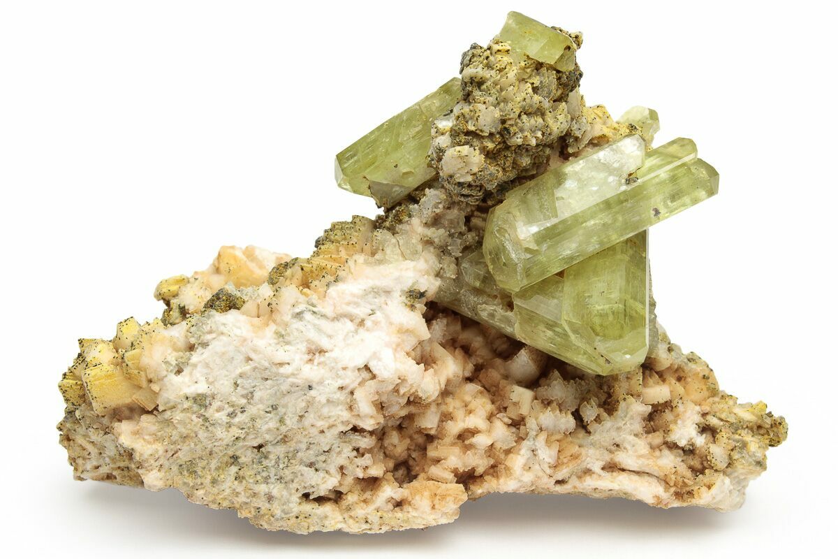 This specimen contains greenish-yellow apatite crystals that formed on a cluster of calcite and feldspar. This crystal cluster was collected from Imilchil, Morocco.