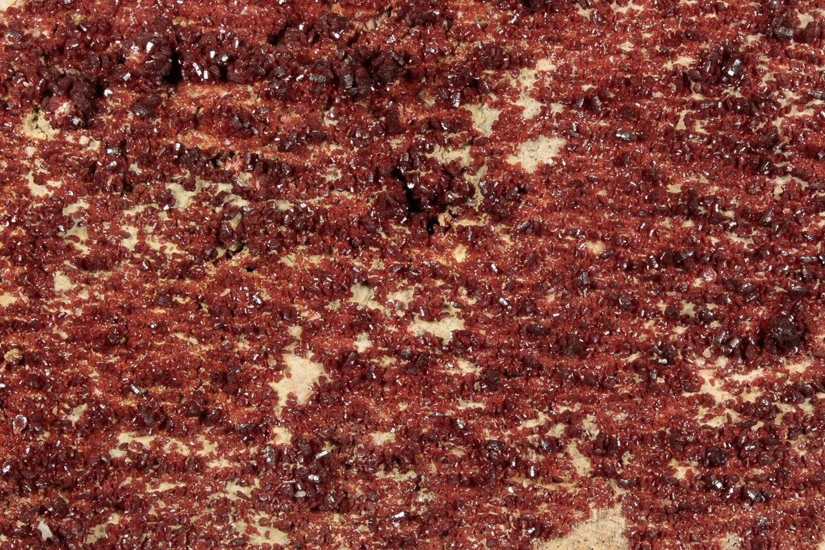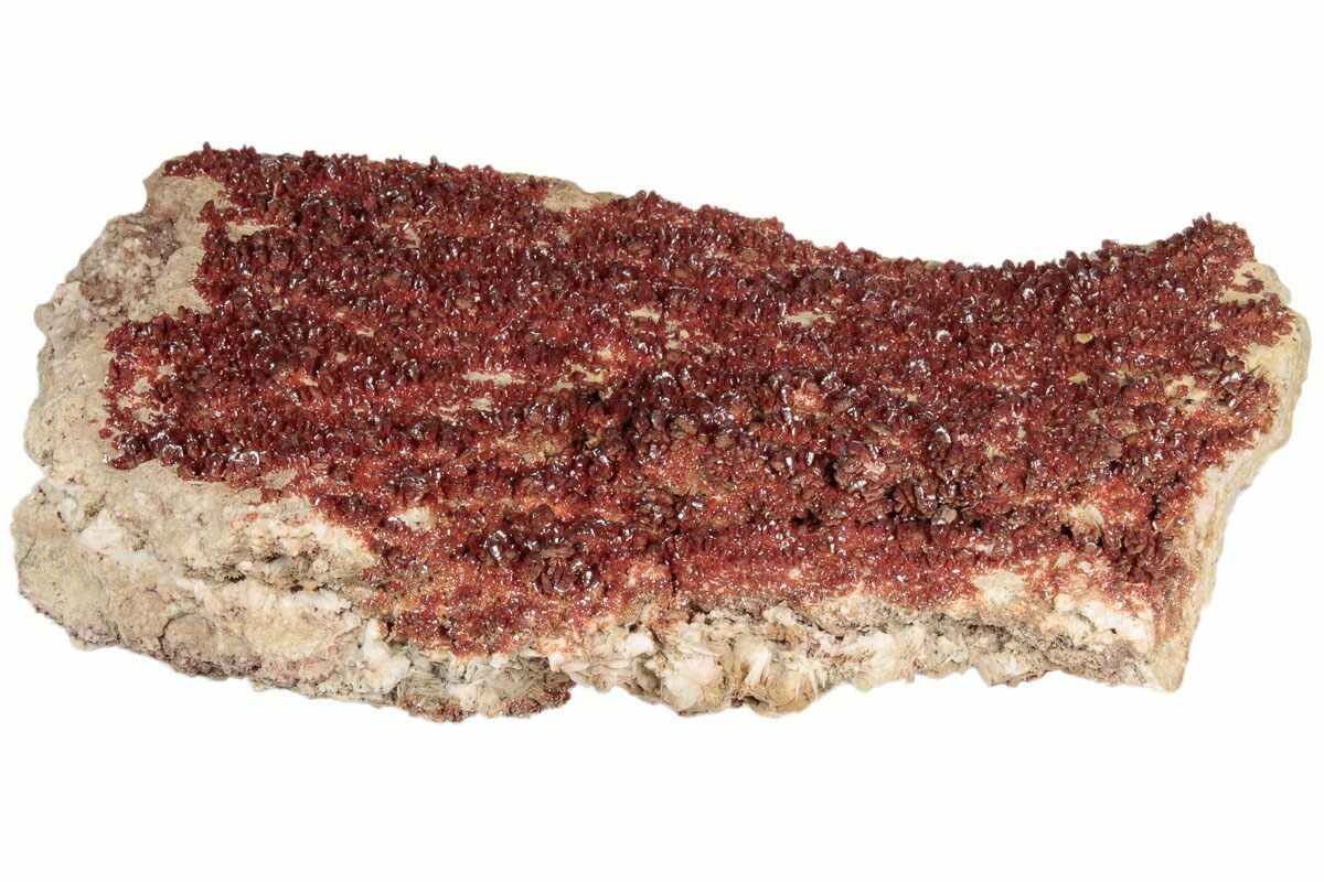 This is a huge plate of sparkling, ruby-red vanadinite crystals on matrix, collected from the Mibladen mining district of Morocco. The size of the vanadinite crystals are on the small to medium side but cover most of the specimen and exhibit a gorgeous luster. Their deep red coloration contrasts nicely against the beige matrix that's packed with white barite crystals.