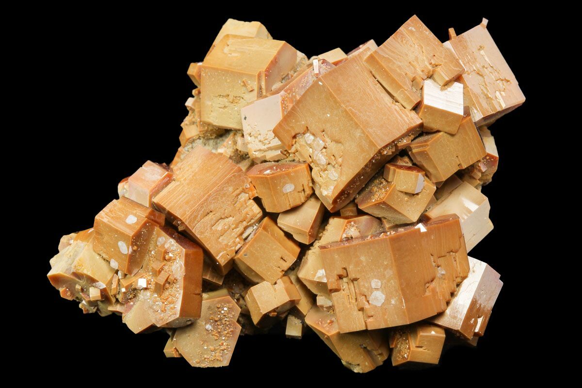 This is a pristine cluster of large deep red and light brown, vanadinite crystals from Midelt, Morocco. They exhibit excellent color saturation, and a mirror luster.