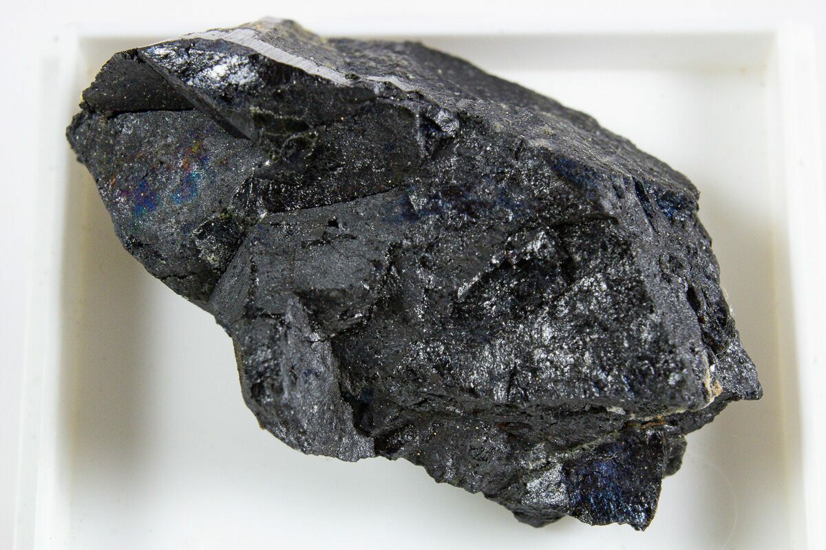 This is a lustrous, 1.4" wide, dark black chevkinite-(Ce) specimen, collected from Arondu in Gilgit-Baltistan, Pakistan. Comes with an acrylic display case and mineral tack.