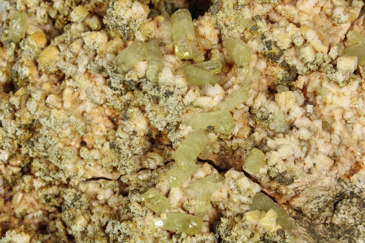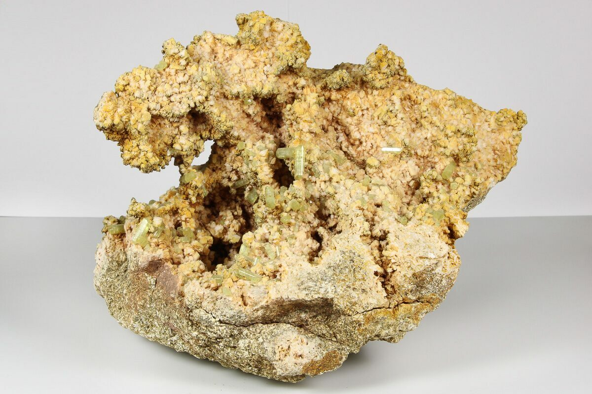 This huge specimen contains multiple clusters of greenish-yellow apatite crystals that formed on a mass of feldspar. This crystal cluster was collected from Imilchil, Morocco.
