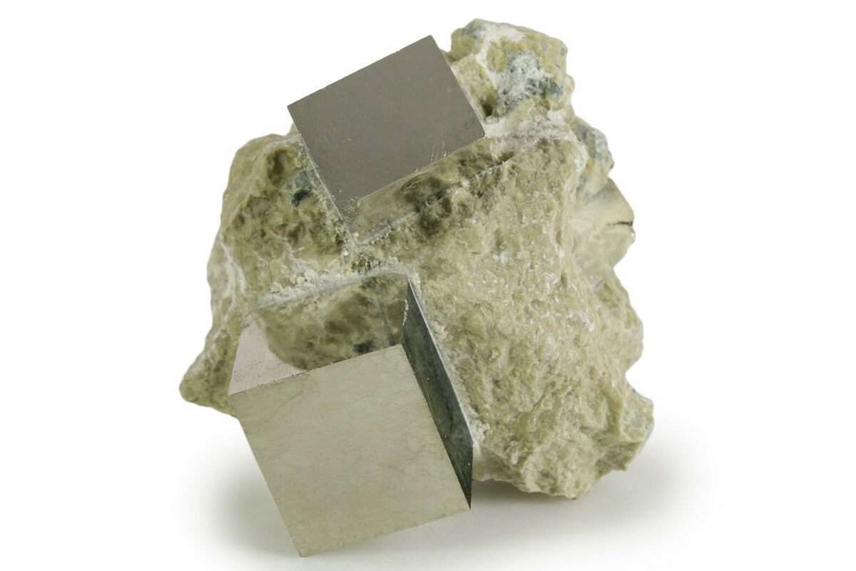 At first glance some people assume that these pyrite cubes are man-made, but the amazing thing is that they are natural! Pyrite from this location is famous for its beautiful shine, near-perfect cubic formation, and sculptural appearance. Because the matrix rock is soft, the cubes often come loose during collection. Care is taken during preparation to stabilize, repair, and make sure everything is remounted in its natural position: no specimens are composites. This means that nearly all of the pyrite cubes still in the rock from this locality have been remounted, and most clusters of multiple cubes have been stabilized.