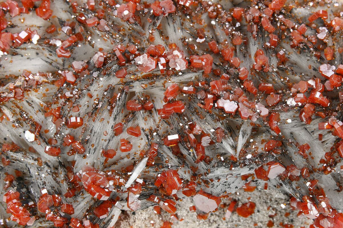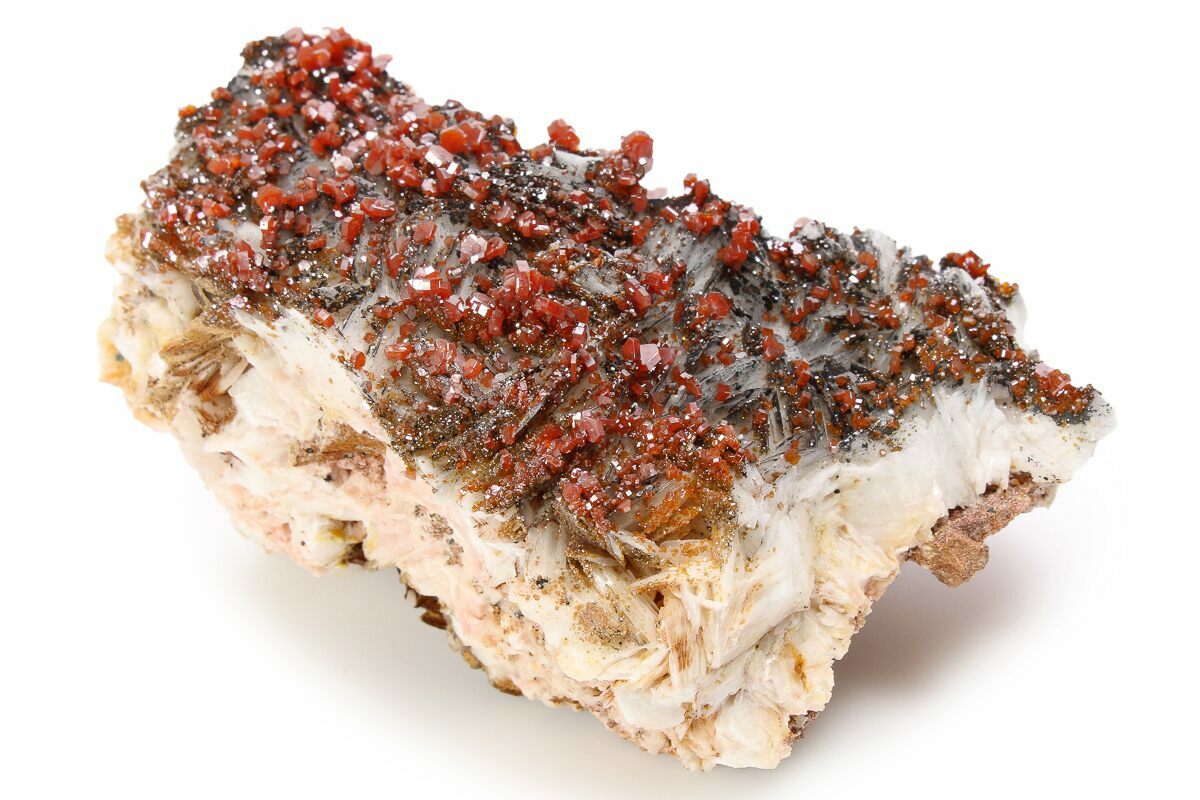 Vanadinite from Morocco is world-famous for producing some of the finest red crystal specimens on the planet. In the arid hills surrounding Mibladen and Taouz, vanadinite forms as vibrant clusters of hexagonal prisms, often with a deep crimson to orange-red color that seems to glow against the pale desert matrix. These crystals typically develop in dense groups, coating barite blades or covering weathered limestone with dazzling, glassy faces and sharp geometric symmetry. The dryness of the region and the slow oxidation of ancient lead deposits create the perfect geochemical environment for vanadinite to grow with exceptional clarity, luster, and intensity of color. Moroccan vanadinite is highly prized by collectors for its bold aesthetics, architectural crystal formations, and the consistent quality that has made these localities the global benchmark for the species.