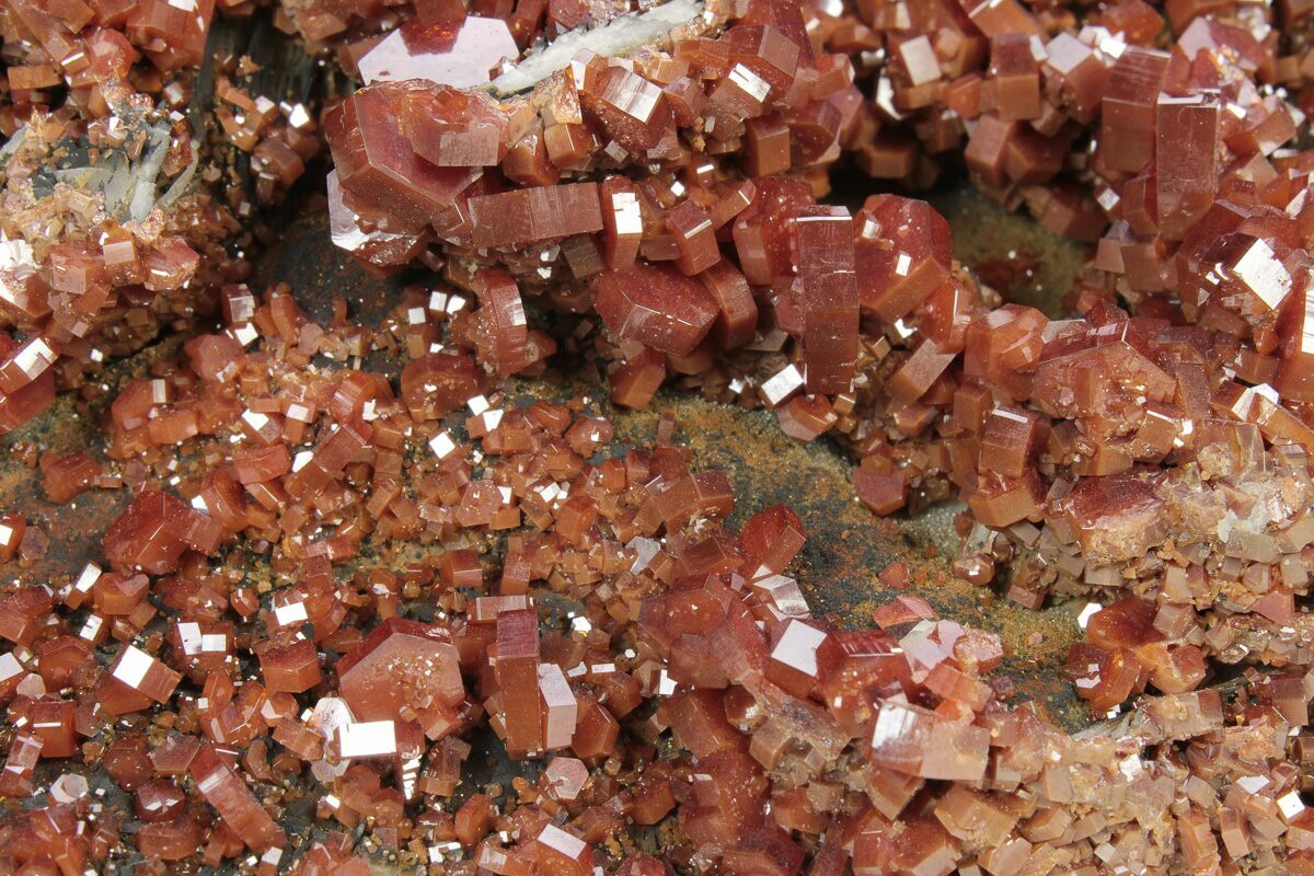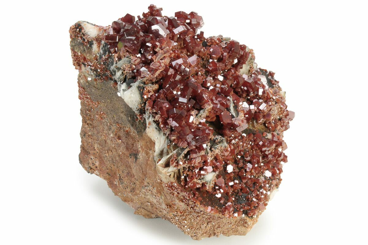 Vanadinite from Morocco is world-famous for producing some of the finest red crystal specimens on the planet. In the arid hills surrounding Mibladen and Taouz, vanadinite forms as vibrant clusters of hexagonal prisms, often with a deep crimson to orange-red color that seems to glow against the pale desert matrix. These crystals typically develop in dense groups, coating barite blades or covering weathered limestone with dazzling, glassy faces and sharp geometric symmetry. The dryness of the region and the slow oxidation of ancient lead deposits create the perfect geochemical environment for vanadinite to grow with exceptional clarity, luster, and intensity of color. Moroccan vanadinite is highly prized by collectors for its bold aesthetics, architectural crystal formations, and the consistent quality that has made these localities the global benchmark for the species.
