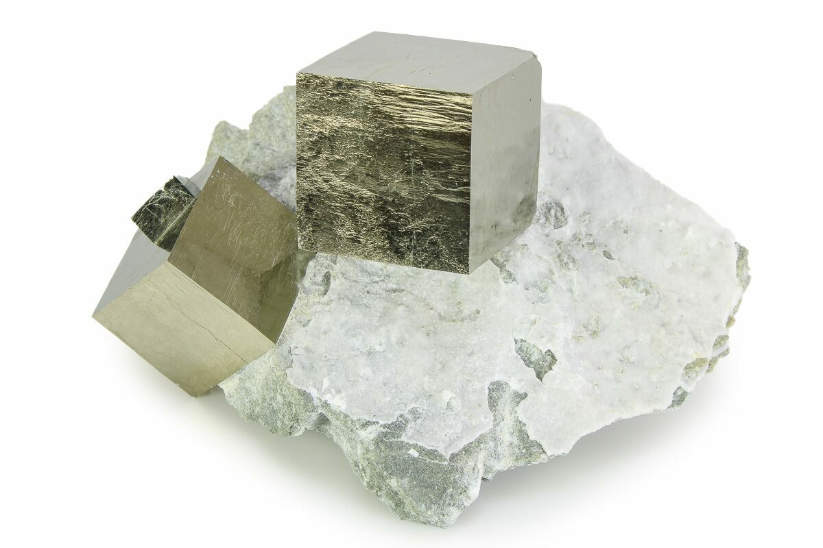 At first glance some people assume that these pyrite cubes are man-made, but the amazing thing is that they are natural! Pyrite from this location is famous for its beautiful shine, near-perfect cubic formation, and sculptural appearance. Because the matrix rock is soft, the cubes often come loose during collection. Care is taken during preparation to stabilize, repair, and make sure everything is remounted in its natural position: no specimens are composites. This means that nearly all of the pyrite cubes still in the rock from this locality have been remounted, and most clusters of multiple cubes have been stabilized.