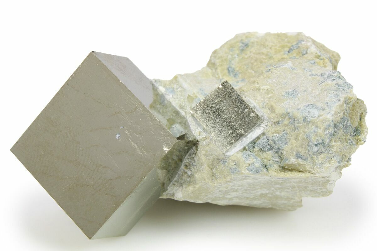 These are two cubes of pyrite that're still embedded within their natural matrix, collected from the famous Victoria Mine near Navajun, Spain. The pyrite has a wonderful, golden metallic luster and the largest cube measures .73" wide.