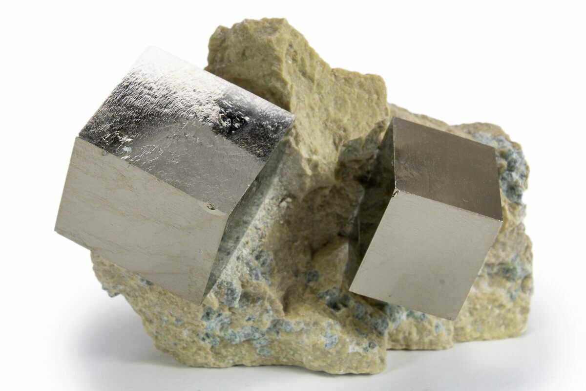 At first glance some people assume that these pyrite cubes are man-made, but the amazing thing is that they are natural! Pyrite from this location is famous for its beautiful shine, near-perfect cubic formation, and sculptural appearance. Because the matrix rock is soft, the cubes often come loose during collection. Care is taken during preparation to stabilize, repair, and make sure everything is remounted in its natural position: no specimens are composites. This means that nearly all of the pyrite cubes still in the rock from this locality have been remounted, and most clusters of multiple cubes have been stabilized.