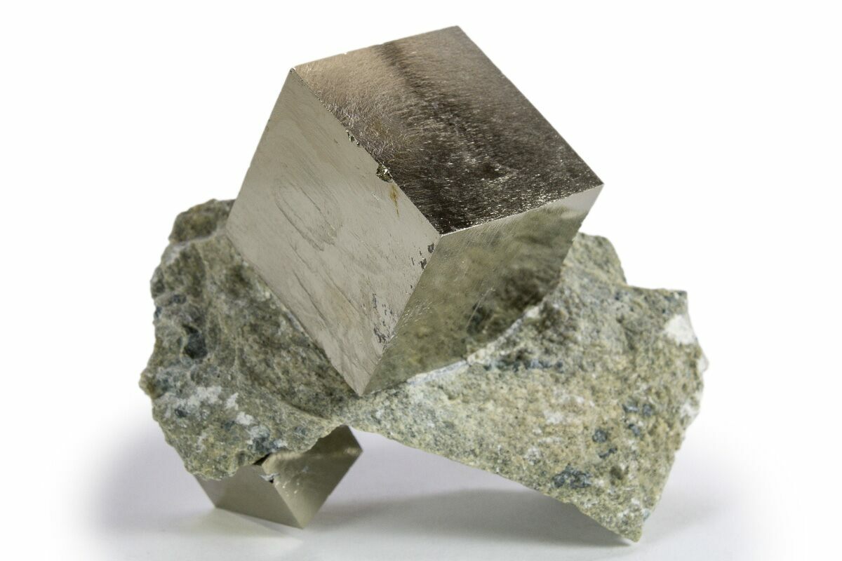 At first glance some people assume that these pyrite cubes are man-made, but the amazing thing is that they are natural! Pyrite from this location is famous for its beautiful shine, near-perfect cubic formation, and sculptural appearance. Because the matrix rock is soft, the cubes often come loose during collection. Care is taken during preparation to stabilize, repair, and make sure everything is remounted in its natural position: no specimens are composites. This means that nearly all of the pyrite cubes still in the rock from this locality have been remounted, and most clusters of multiple cubes have been stabilized.