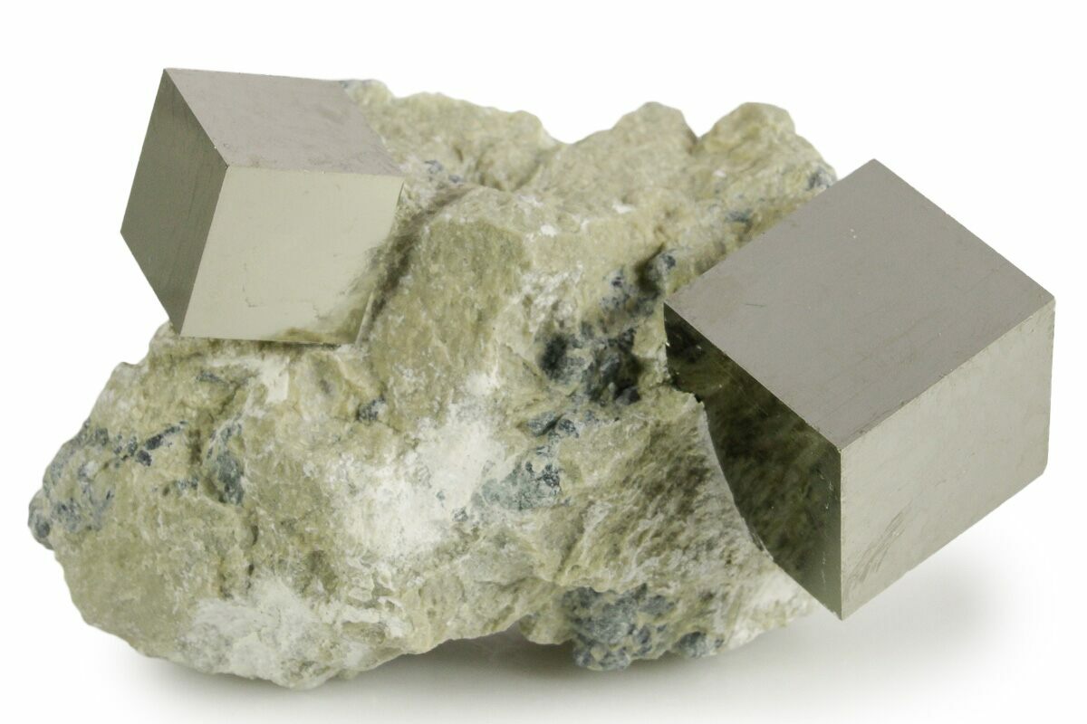 These are two cubes of pyrite that're still embedded within their natural matrix, collected from the famous Victoria Mine near Navajun, Spain. The pyrite has a wonderful, golden metallic luster and the largest cube measures .62" wide.