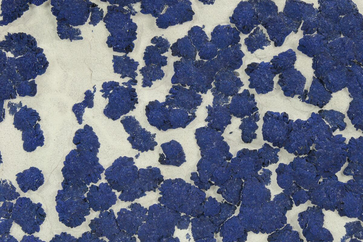 This is an association of vibrant blue azurite suns on a kaolinitic siltstone/sandstone matrix. It was collected from the Malbunka Copper Mine in the Northern Territory of Australia.