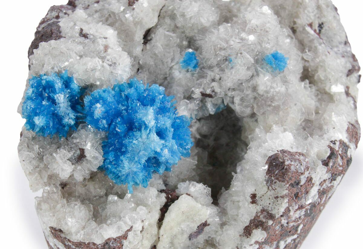 The most celebrated minerals from the Deccan Traps are the zeolites, a broad group of hydrated aluminosilicates that form in the rock’s open cavities. Notable species include brilliant, transparent apophyllite crystals—often mint green or water-clear—alongside delicate sprays of stilbite, heulandite, clinoptilolite, mesolite, scolecite, and natrolite. These minerals frequently grow together, producing striking aesthetic arrangements: apophyllite perched on peach-colored stilbite “bowties,” needle-like mesolite clusters exploding out of basalt pockets, or shimmering heulandite druses lining geodes. The region is also the world’s premier source for vivid blue cavansite and its rarer green cousin, pentagonite, which form radiant starburst clusters on matrix. While the Deccan Traps are volcanic in origin, they are celebrated globally among collectors for these extraordinary mineral treasures—vibrant, elegant, and unmistakably Indian in character.