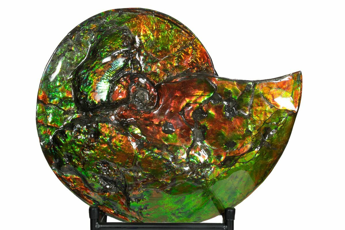In exceptional fossil deposits, this preservation gives rise to ammolite, one of the few organic-derived gemstones recognized in the world. Ammolite forms when the original aragonitic nacre of ammonite shells is preserved and mineralized without recrystallization. Its vivid flashes of red, green, blue, and violet result from microscopic layering within the aragonite that causes light interference, much like opal or mother-of-pearl. Ammolite is both a biological artifact and a mineralogical rarity—a direct link between ancient life and modern gemology.
