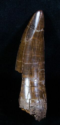 Spinosaurus had a skull with a narrow snout filled with approximately 64 straight conical teeth with two carinae that lacked serrations. The hypothesis is that Spinosaurus was a semi-aquatic piscivore, meaning that it ate fish. The teeth had an interesting arrangement with 12-14 teeth in the pre-maxilla that were slightly curved with the 2nd and 3rd of these teeth being much larger than those around them. Teeth from the lower jaw fit into the gaps created by this space. Small Spinosaurus teeth from 1-3 inches long are surprisingly common in the Kem Kem Beds of Morocco, but including the roots they could probably reach about 8-10 inches long. View Spinosaurus Teeth For Sale...
