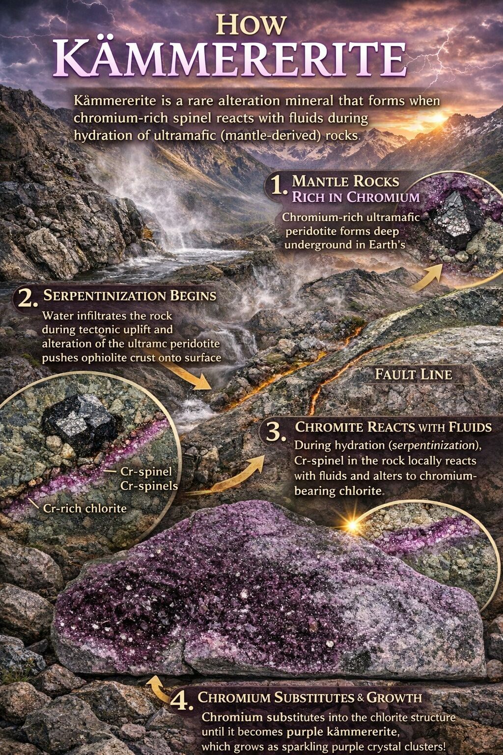 But the transformation isn’t over. The same fluids that rewrote the silicate minerals now turn their attention to chromium spinel. Around each chromite grain, chemical reactions bloom outward like halos, forming chromium-rich chlorite rims—the first hint that something unusual is happening. When enough chromium finally replaces aluminum inside the lattice of clinochlore, the green mineral crosses a threshold, and Kämmererite emerges in shades of purple, lilac, and violet.