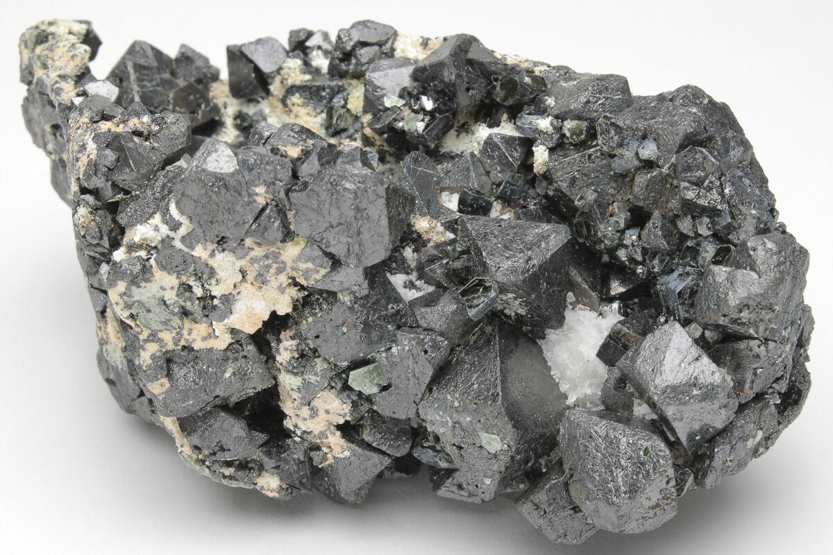Magnetite typically appears black to dark gray with a metallic to dull luster. Well-formed crystals are commonly octahedral, though dodecahedral crystals and massive granular forms are also widespread. One of magnetite’s most distinctive traits is its density—pieces feel noticeably heavy for their size. Magnetite has a black streak, a Mohs hardness of about 5.5–6.5, and is often found associated with other iron minerals such as hematite, ilmenite, and pyrite.