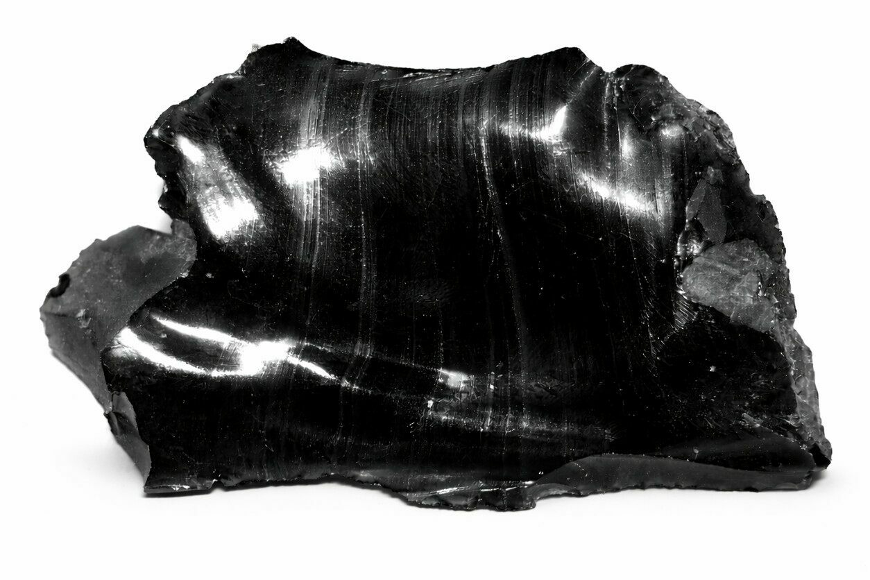 Obsidian’s smooth black surface and glassy luster make it easy to imitate, and the market is filled with convincing stand-ins that range from harmless look-alikes to intentional fakes. The most common material passed off as obsidian is dyed industrial glass, which may look nearly identical to natural obsidian when polished, but often contains perfectly round air bubbles that reveal its manufactured origin. Another widespread impostor is black slag glass (sometimes called “slag obsidian”), a waste product of metal smelting. Slag can appear glossy and dark, but its internal flow textures tend to look unnatural and chaotic compared to the silky, volcanic stretching seen in real obsidian. Dyed black onyx is also frequently misrepresented as obsidian in jewelry—onyx is a real mineral, but it is microcrystalline quartz, heavier, waxier in polish, and shows parallel banding under magnification rather than a glassy fracture. The cheapest imitations are resin and plastic, which mimic the color but not the density, warmth, or fracture behavior of natural volcanic glass. Less common but still encountered are painted ceramics, dyed chalcedony, and even glass-based “spiritual market” carvings sold without disclosure.