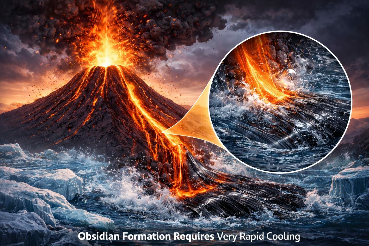 Rapid Cooling Environment - Cooling happens too fast for crystals to form, essentially “freezing” the melt into natural glass. This can occur when lava meets the sudden chill of a lake or ocean, collides with groundwater or rain-soaked earth, or erupts into cold, high-elevation air. It can also form during violent explosions, when lava depressurizes so rapidly that it shatters into glass before crystals ever have a chance to grow.