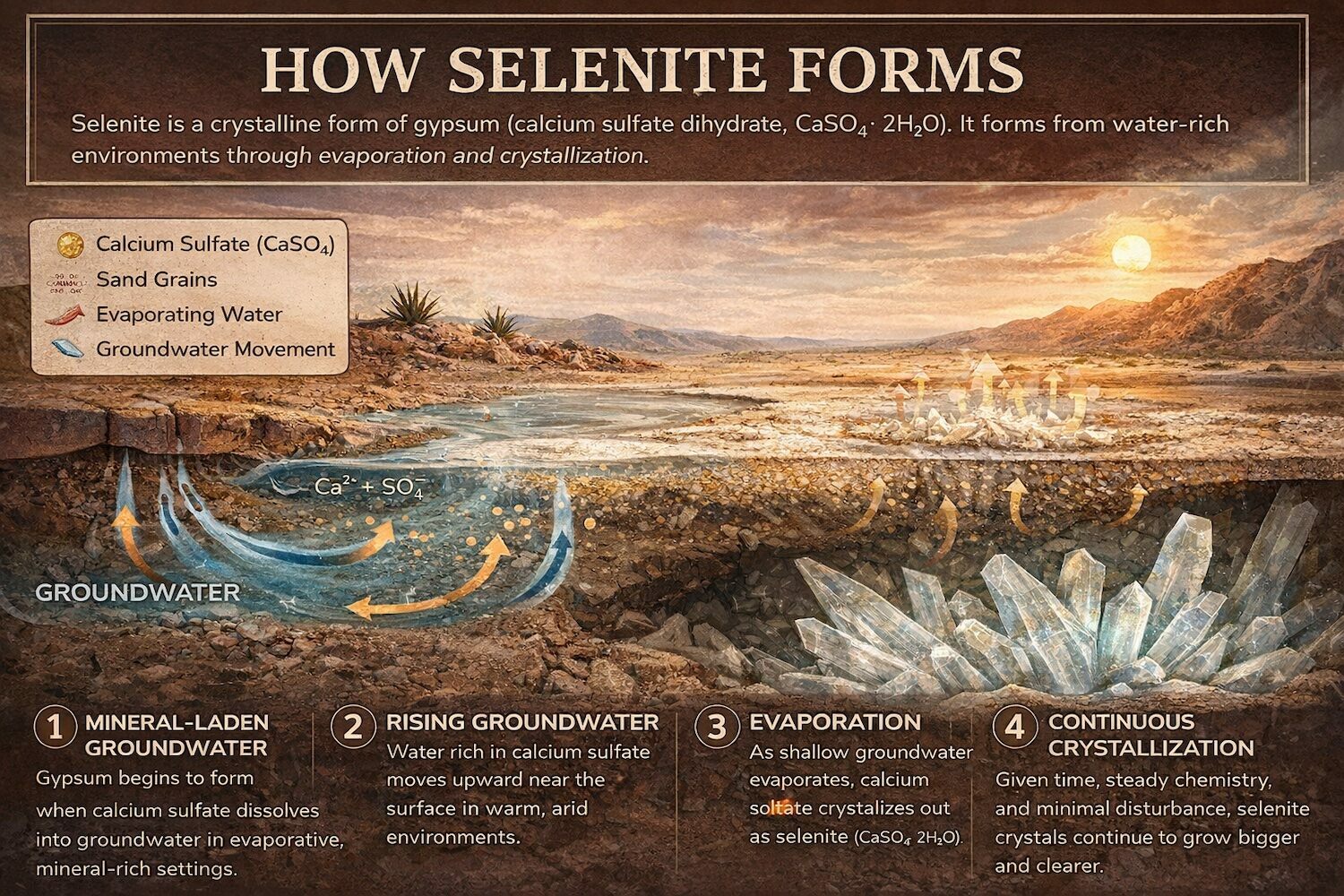 Selenite forms in evaporite environments—places where bodies of water slowly evaporate, leaving dissolved minerals behind. These settings include shallow marine basins, saline lakes, playas, and underground cavities fed by mineral-rich groundwater. As water evaporates, calcium sulfate becomes oversaturated and begins to crystallize.