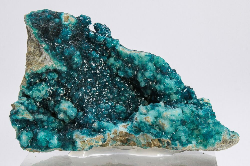 Because it forms in this dynamic, near-surface environment, veszelyite is typically rare and highly localized, appearing only where very specific chemical conditions briefly coincide. It most often occurs as small but sharply formed crystals perched on matrix rock, their crisp edges reflecting the delicate balance of factors that allowed them to grow. In these oxidation zones—sometimes described as nature’s own mineral-processing laboratory—veszelyite forms alongside a suite of other secondary copper and zinc minerals, all products of the same slow chemical transformation reshaping the original ore.