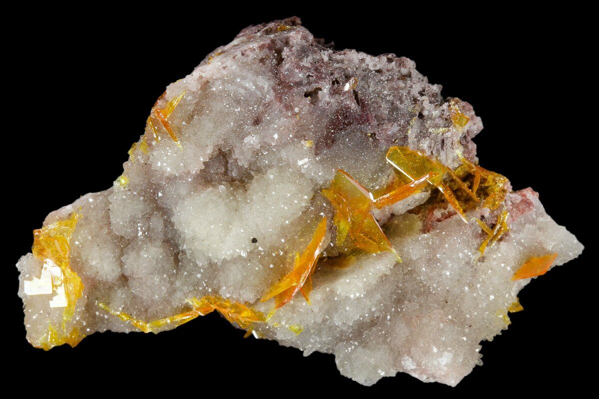 Calcite – a common matrix mineral providing contrast to bright wulfenite crystals