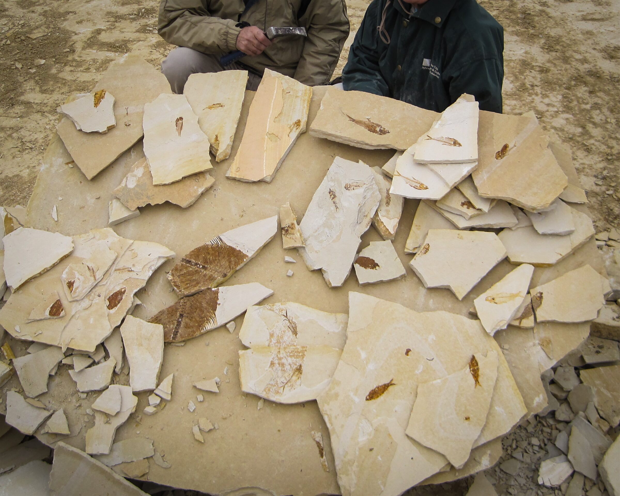 A pile of freshly split Knightia fossil fossil found by customers at the Fossil Lake Safari in Wyoming.