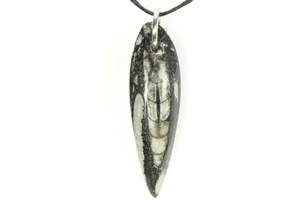 These are small polished Orthoceras (cephalopod) fossils from Morocco. The stones themselves range from 1 1/2 to 2" in length with most being closer to 2" long. The photos are representative of the specimen(s) you will receive. Each specimen has a small drill hole where a ring and 28" adjustable cord have been added.