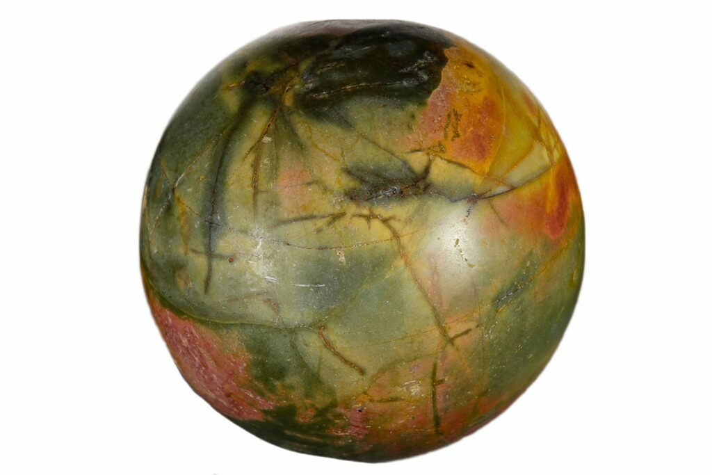 This is a 30mm (1.2") wide polished, Cherry Creek Jasper sphere.