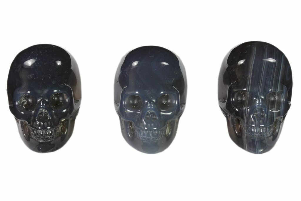 These are 1.5" long skulls made from blue agate from Brazil. The pictures are representative of the specimen(s) you will receive, so there may be some slight variation in shape and color.