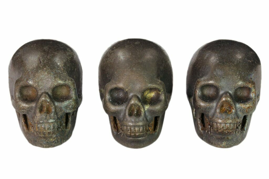 These are 1.5" long skulls made from pyrite. They have been sculpted into the shape of a skull and polished. The pictures are representative of the specimen(s) you will receive, so there may be some slight variation in shape and color.
