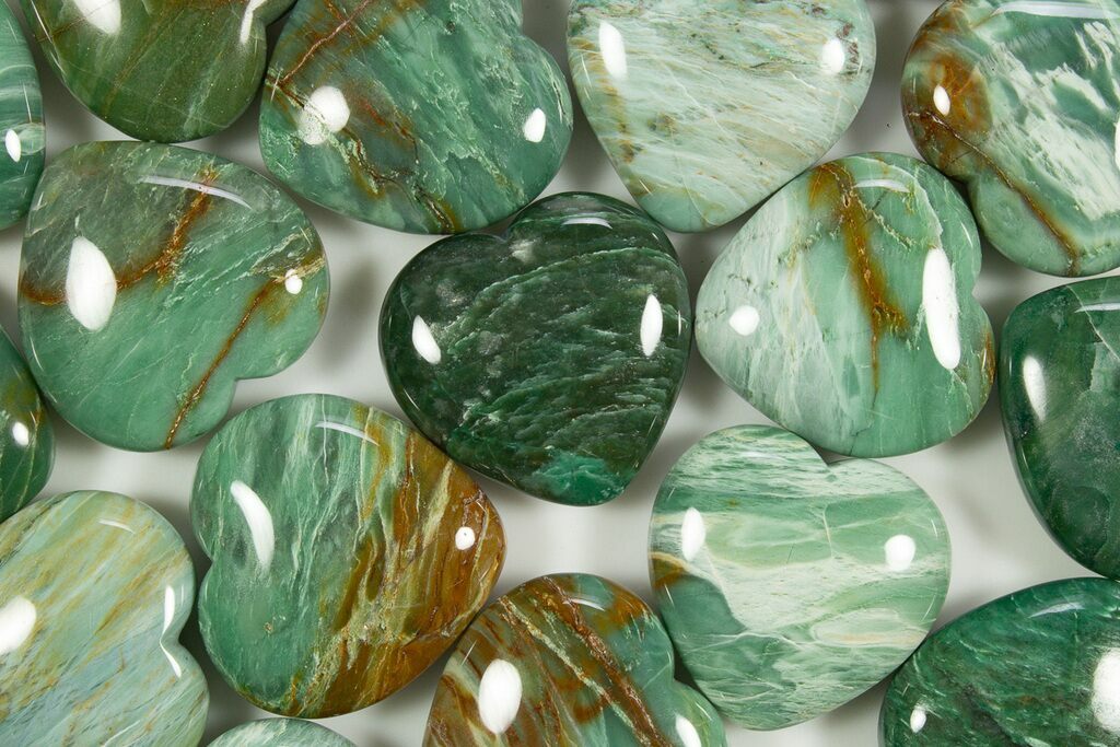 These are polished hearts made from Pilbara prase (chrome-rich chert) collected in Australia. They are hand crafted from natural stone, so there will be some slight variation in size, pattern, and color from specimen to specimen. They measure 1.6" to 1.7" inches wide, with most being 1.7". The pictures are representative of the specimen(s) you will receive