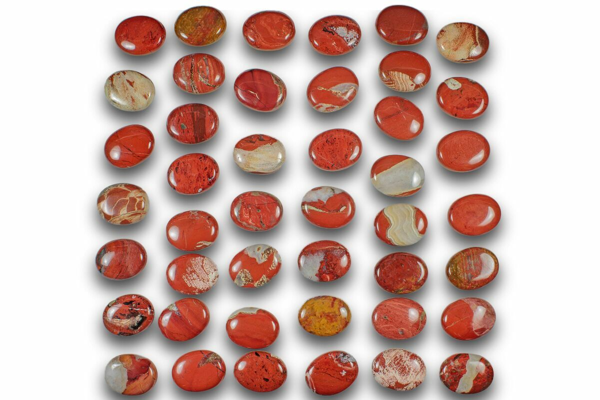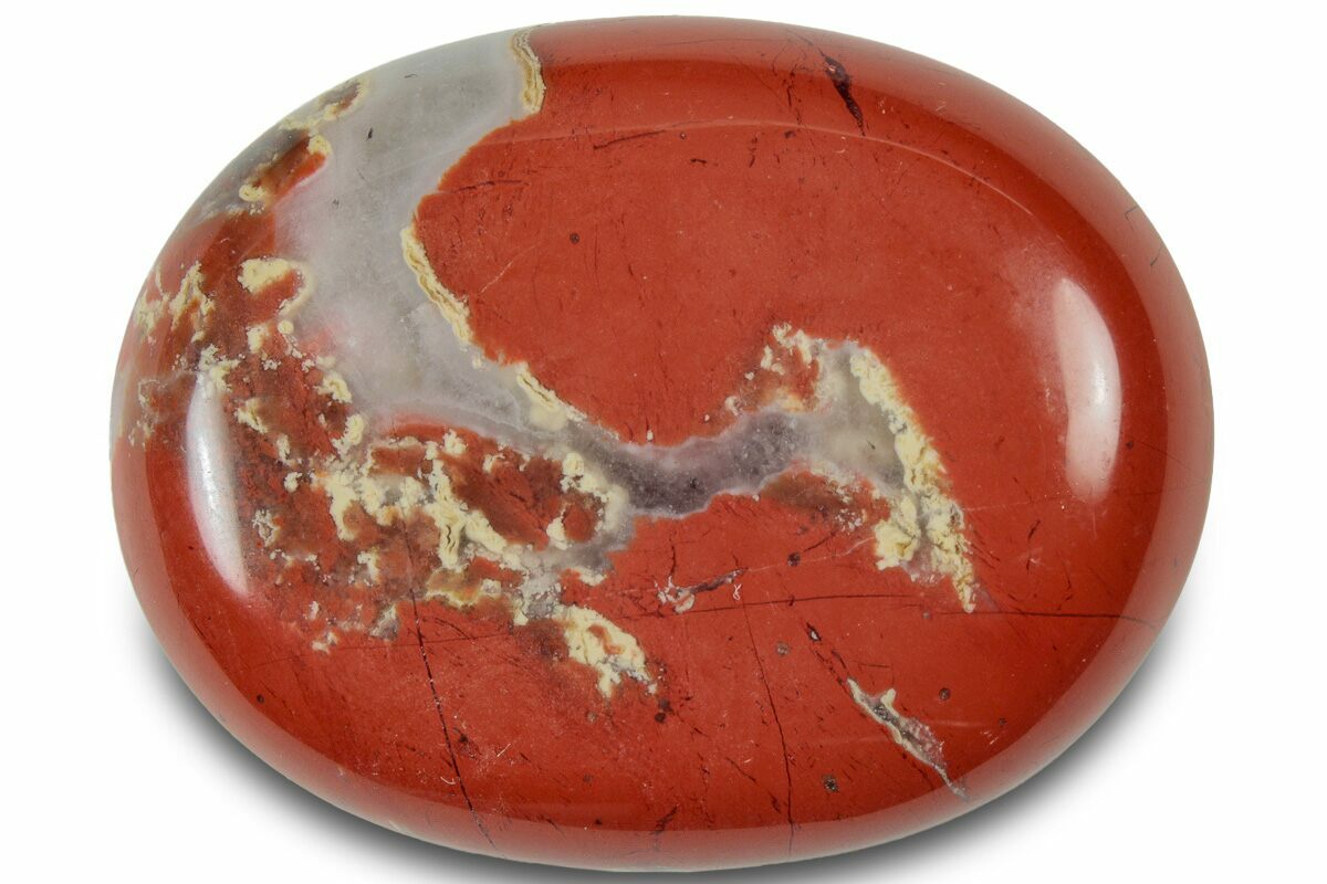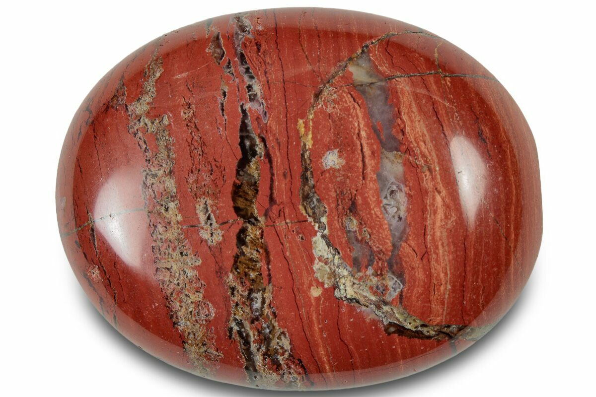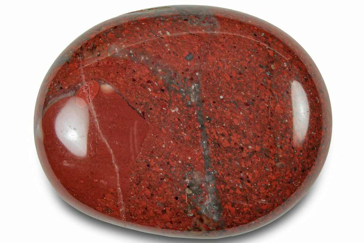 This is a 1.7" polished brecciated red jasper pocket stone. The term "brecciated" means the original formed rock (jasper in this case) was fragmented by geologic processes. These fragments were then cemented together by a silica-rich solution that deposited agate within the open spaces. The pictures are representative of the specimen(s) you will receive, so there may be some slight variation in size, patterns, and color.