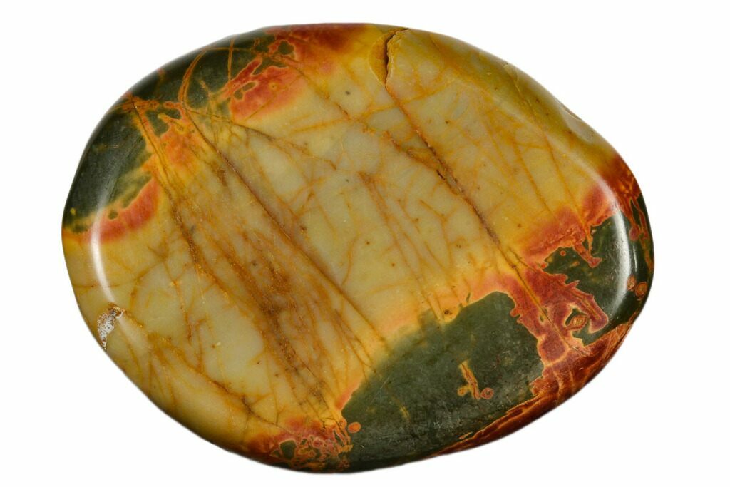 This is a 1.8" polished, cherry creek jasper pocket stone. The stone is flattened on both sides and the exact shape, color, and patterns will vary.