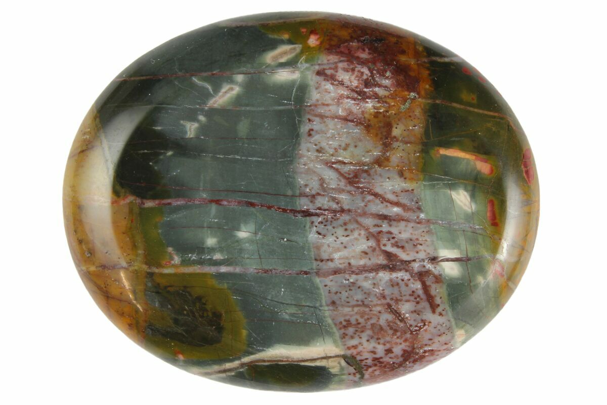Cherry Creek Jasper—also known as Red Creek Jasper—is a vibrant, scenic jasper from China prized for its rich palette of earthy reds, golds, greens, and smoky grays. The stone is famous for its intricate, painterly patterns that resemble abstract landscapes or branching river systems, created by networks of iron-rich veins that formed as silica slowly replaced ancient sedimentary rock. These colorful patterns are the result of varying oxidation states of iron and other trace minerals, giving each piece a dramatic, one-of-a-kind look.