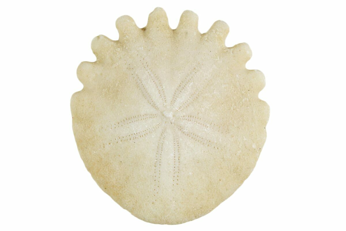 A sand dollar is a highly flattened form of urchin of the order Clypeasteroida. As an echinoderm, they have a pentameral (five-fold) symmetry to their body organization, a water vascular system, and an endoskeleton made of calcite plates. They live in shallow marine environments just below the low tide line, buried in the sand or mud. They range up to about 4 inches (10cm) in diameter. Most are about a third (7mm) to half (12mm) an inch thick, but some are over an inch thick. They are basically circular in shape, though some have flattened or indented sides. While alive, they are covered with velvety-looking spines that they use to move, much like other echinoderms. The most diagnostic indicator of fossil sand dollars is the five ovate form on the top side of the skeleton. These are part of the respiratory system and leave an easily identified “flower” on the skeleton. They are active predators, feeding on crustacean larvae, small copepods, diatoms, and algae.