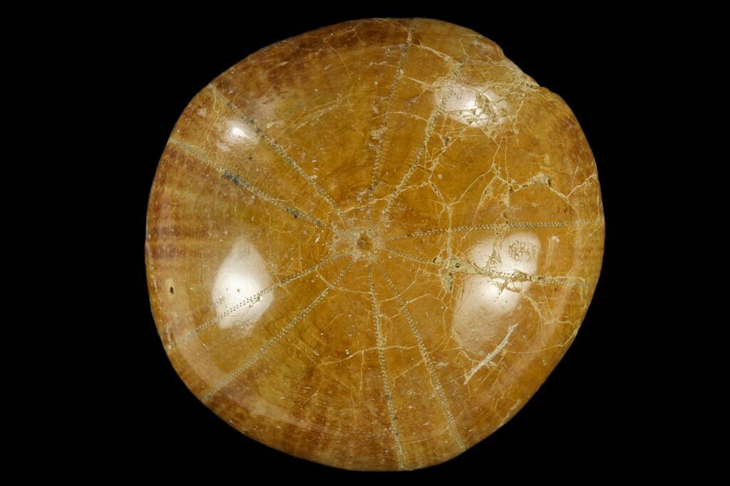 These are beautiful, polished echinoid (sand dollar) fossils from the Mahanjanga Province in Madagascar. We've seen conflicting information from different source on the age of these fossils, but we the best source we have is that they are Paleocene and the genus is Plesiolampas.