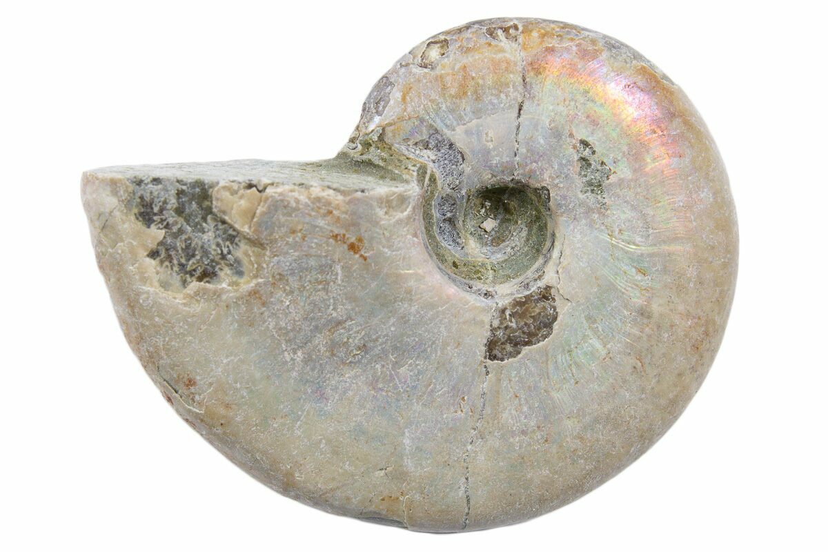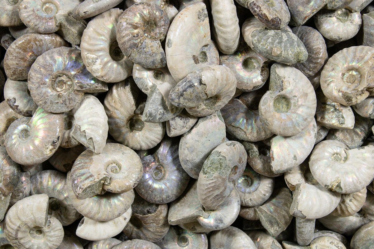 These are beautiful, approximately 110-million-year-old silver iridescent ammonite fossils from the Mahajanga Province of Madagascar. Most specimens are the species Cleoniceras, though a small number of closely related ammonite species may also be included. Each ammonite averages about 3/4" wide, with slight natural variation, and displays striking metallic silver iridescence that flashes as the light moves across the surface.