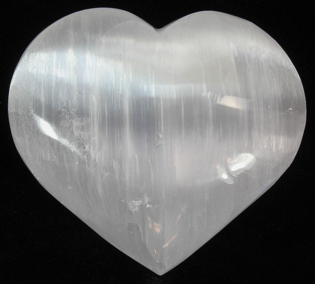 Selenite crystals are white in color and show obvious crystalline structure. Selenite is one of four varieties of the mineral gypsum. Interestingly, gypsum occurs on every continent in the world, and is the most common of all the sulfate minerals. The selenite for these hearts is collected and polished in Morocco.