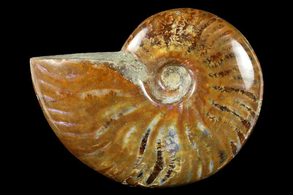 These are flashy red ammonite fossils from Madagascar. They have a natural, red iridescence to them that is quite spectacular when view from different angles. They range from 2 to 2 1/2" wide with most being in the middle of the size range. The photos are representative of what they look like.