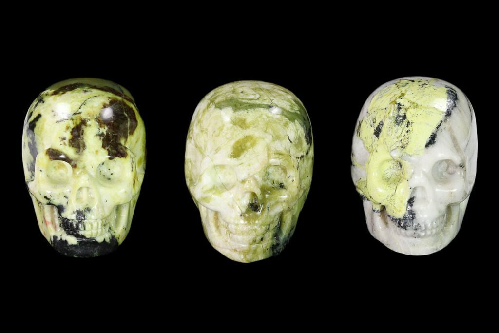 These are 2" long skulls made from yellow turquoise. They have been sculpted into the shape of a skull and polished. The pictures are representative of the specimen(s) you will receive, so there may be some slight variation in shape and color. Many of these skulls have a dark mineral that has magnetic properties.