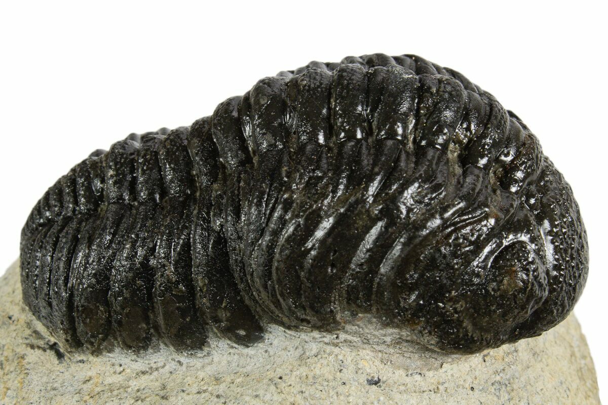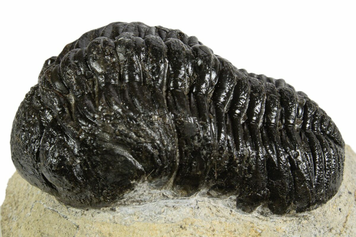 These are Lower Devonian aged phacopid (Austerops or Morocops) trilobite fossils collected near Ofaten, Morocco. They have been prepared using airscribes to remove the hard limestone surrounding them and they look like they are ready to crawl off the rock. Some are laid out prone, though most are curled or enrolled and measure between 2" and 3" long if outstretched, with some being slightly smaller.