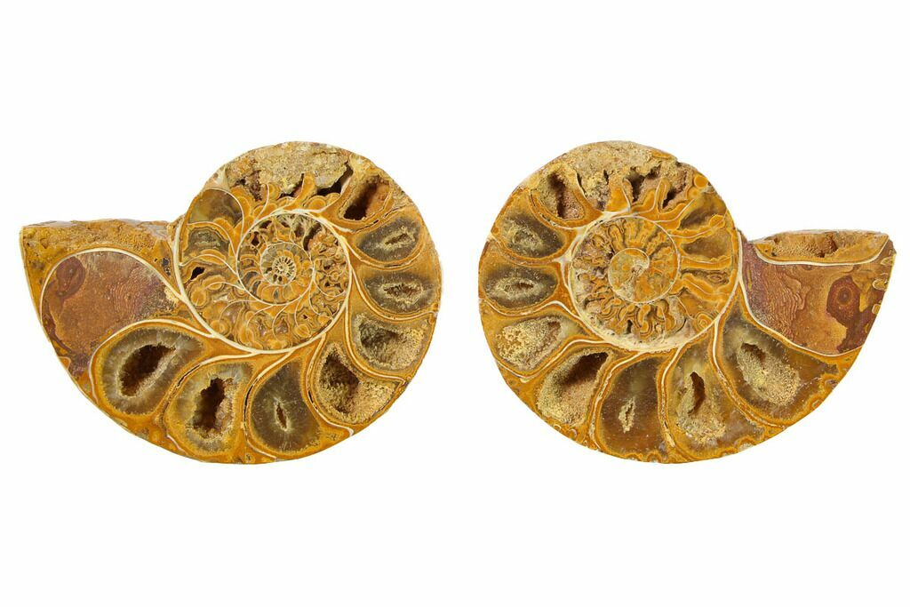 These are cut and polished orange ammonites collected near Sakaraha in the Tulear Province of Madagascar. Most of the cut and polished ammonites that you see from Madagascar are Cretaceous in age, but these ones with a orange/yellow/pink coloration are are Late Jurassic (Oxfordian Stage) in age. The photos are some representative examples of what they look like. For each ammonite ordered you will receive both halves. There is some variation in size, but they all range from about 1.7" to 2" wide (each half)