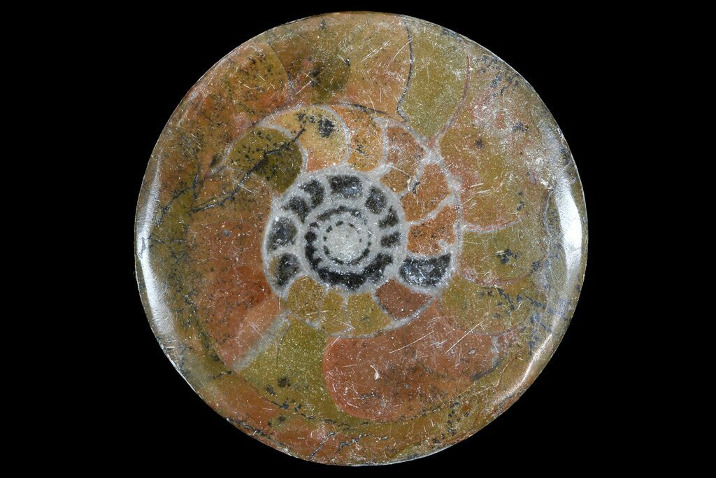 These are fossil goniatites, a close relative of ammonites that have been polished and the surrounding rock shaped into a round or oval "button" These Goniatites are Devonian in age and are quarried from the Atlas Mountains in Morocco. The buttons range from 2 to 3" wide with most being in the middle of that size range. The photos are representative of the pieces you will receive though there is a lot of variation in exact size and shape.
