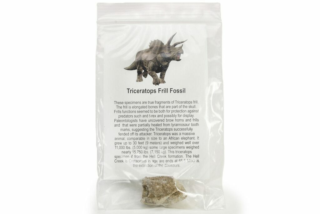 These are sections of frill/skull from the famous herbivorous, ceratopsian dinosaur, Triceratops. They come from the Late Cretaceous-aged Hell Creek Formation and are approximately 66 million years old. These specimens range from 1" to 3" and the photos are representative of the specimen(s) you will receive.