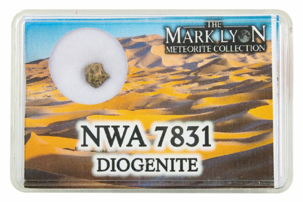 These are authentic fragments of the diogenite meteorite, NWA 7831, collected near Chouichiyat in the Saguia el Hamra region of Western Sahara. Each meteorite weighs less than 1 gram, measures approximately .3" wide, and is accompanied by the pictured acrylic display case. The photos are representative of the specimen(s) you will receive, so there will be variation in size and shape from specimen to specimen.